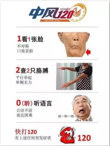 中国推出了适合国人的急性卒中快速识别方法即“中风120”,是一种适用于国人的迅速识别脑卒中和即刻行动的策略: